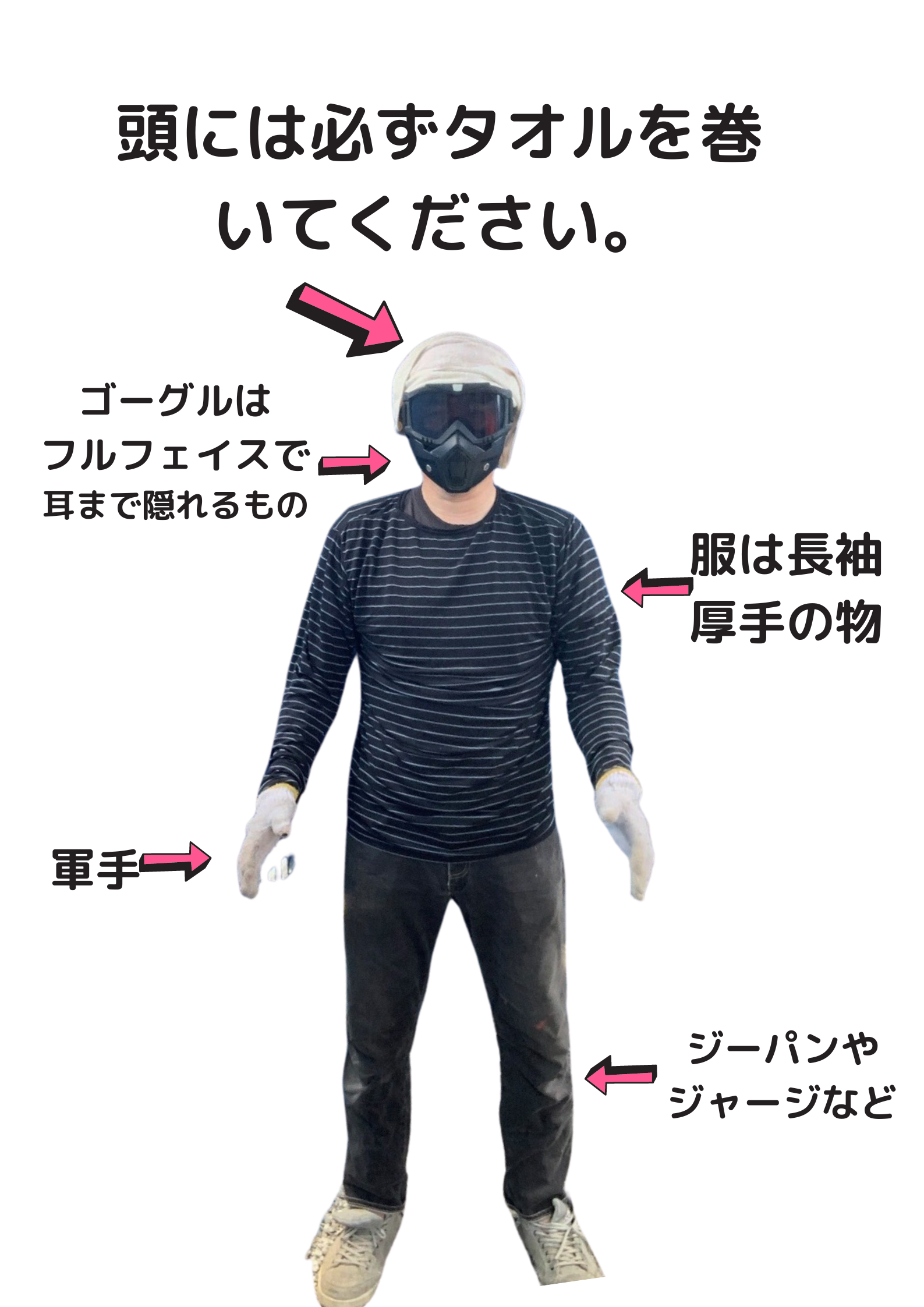 フルフェイスゴーグルは別途必要です。当施設でも3000円(税別)にて販売しております。