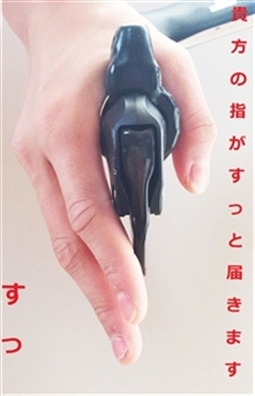 使用方法ですが、ハンドルから垂直に出っ張りができるので、そこに親指と人差し指の間をはめ込みつつブレーキを握ります。