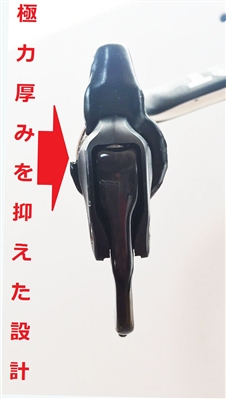 確かにそうかもしれないと思い、試行錯誤していく中でたどり着いたのが「ポリフォレフィン」樹脂です。この樹脂はとても触り心地が良く、さらっとして滑りやすい感じです。ブレーキに指が掛かりやすくなり、より操作がスムーズになる様採用致しました。